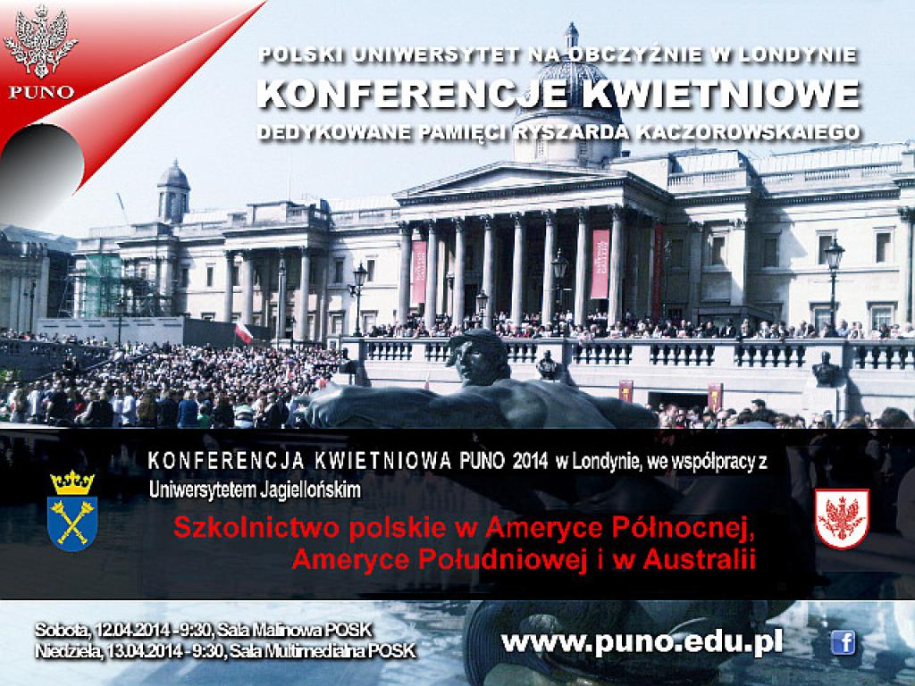 Polski Uniwersytet na Obczyźnie (PUNO) zaprasza na konferencję zatytułowaną "Szkolnictwo polskie w Ameryce Północnej i Południowej oraz w Australii. Jest to trzecia z cyklu Kwietniowych Konferencji o polskim szkolnictwie na obczyźnie.